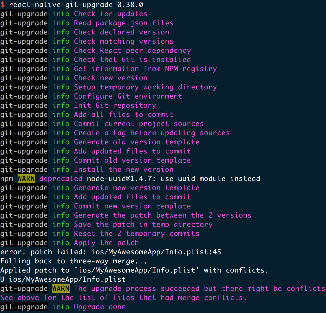 Today I am proud to introduce a new tool that helps solve this problem. The tool is called react-native-git-upgrade and uses Git behind the scenes to resolve conflicts automatically whenever possible.